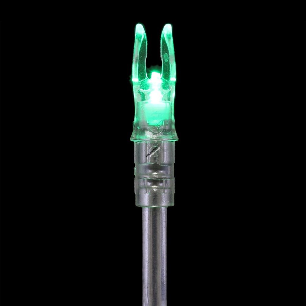 Inside the Nightfire Nock there is a micro switch which activates when the arrow is released. The nock is later deactivated by means of an arrow tip or the included metal pin. There is a small opening on the side of the nock for this purpose.